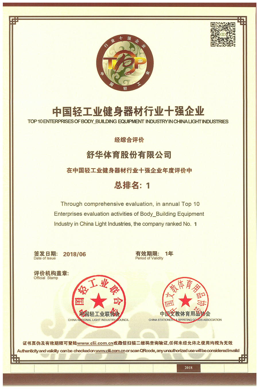 2017至2018年,bbin视讯连续两年以第一名入围年度“中国轻工业健身器材行业十强企业”;2018年,bbin视讯入驻平昌冬奥会“中国之家”,同年荣获“中国健身器材行业最具影响力品牌”。 From 2017 to 2018, Shuhua was named the "Top 10 Enterprise of Body Building Equipment Industry in China Light Industries " for the second consecutive year. In 20